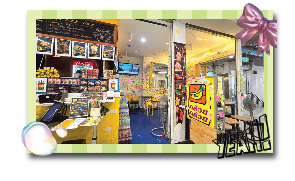 実際に กล้วย กล้วย banana banana を訪れると、ドラマの雰囲気をそのまま感じることができます。店内は明るくカジュアルで、バナナワッフルやバナナボールなど、バナナを使ったスイーツが並ぶ親しみやすいデザートショップ。壁には訪れた人々が各々自由にメッセージを書いた付箋で埋め尽くされています。特別な観光地というより、若者がふらりと立ち寄る日常の場所です。
